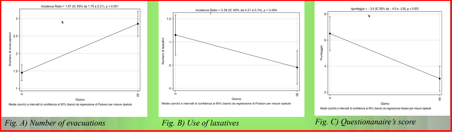 - Fig. A: The average number of bowel movements almost doubled after 30 days of treatment (IR = 1,97; IC 95%: 1,75–2,21; p < 0,001)