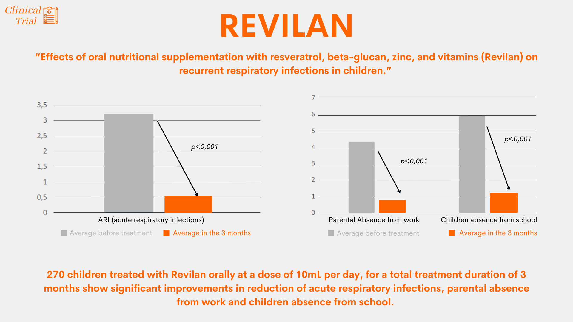 Gruppo FarmaImpresa conducted a multicenter observational clinical study on 270 children with an average age of 5.7 years and a diagnosis of recurrent respiratory infections. Patients were treated with Revilan at a dose of 10 mL/day for 3 months, and the results were compared to the period before taking the supplement.