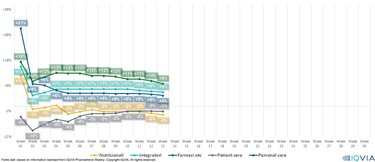 - Anche il comparto veterinario inizia a perdere terreno, con un calo di un punto percentuale tra la 12ª e la 13ª settimana.
