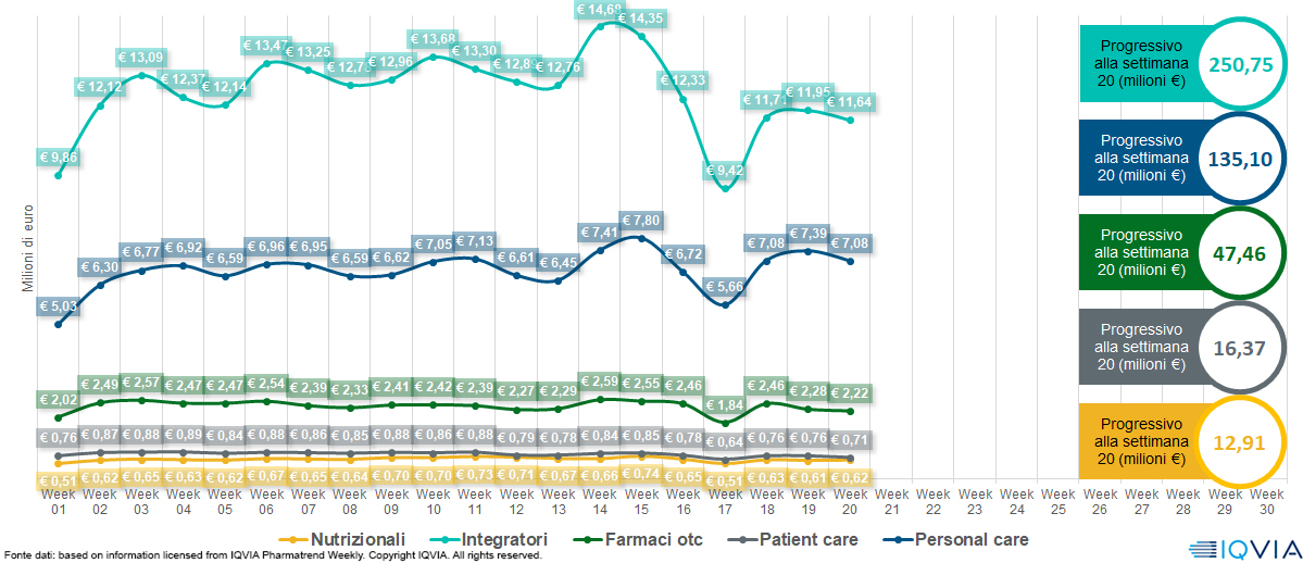 Tra i singoli segmenti, si segnala un calo per i prodotti stagionali contro tosse e raffreddore, pur mantenendo una buona performance cumulata, mentre si conferma il trend positivo per i prodotti urologici e veterinari.