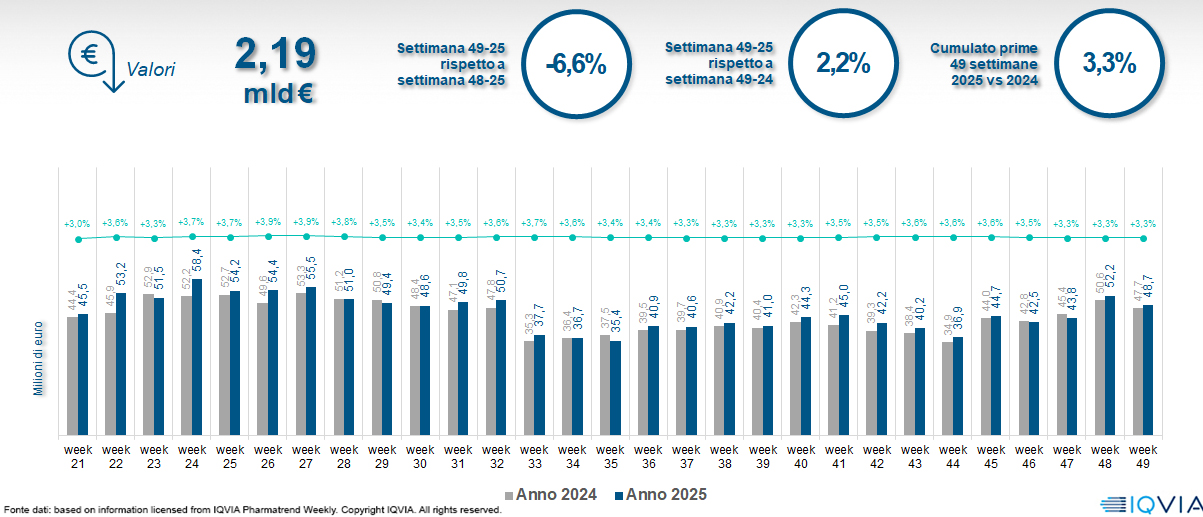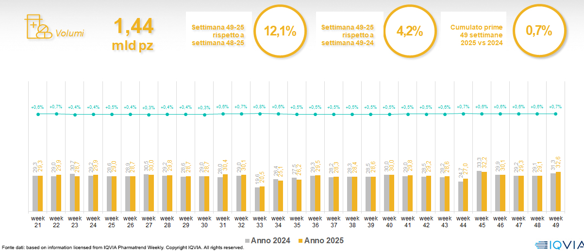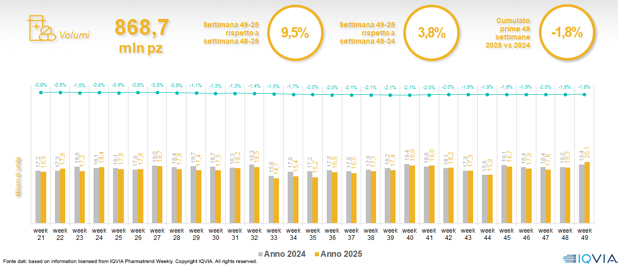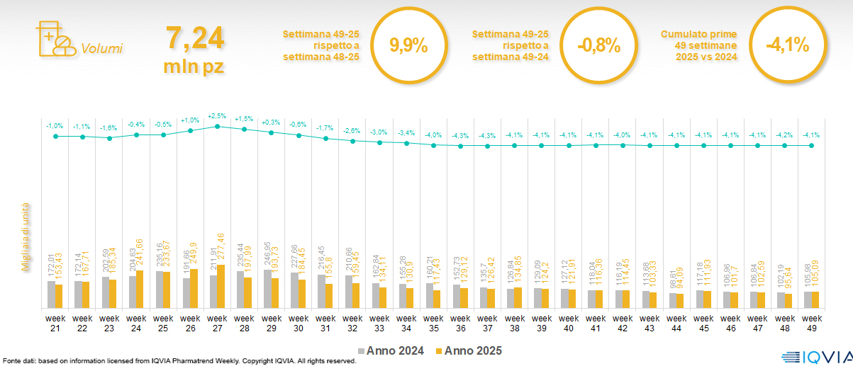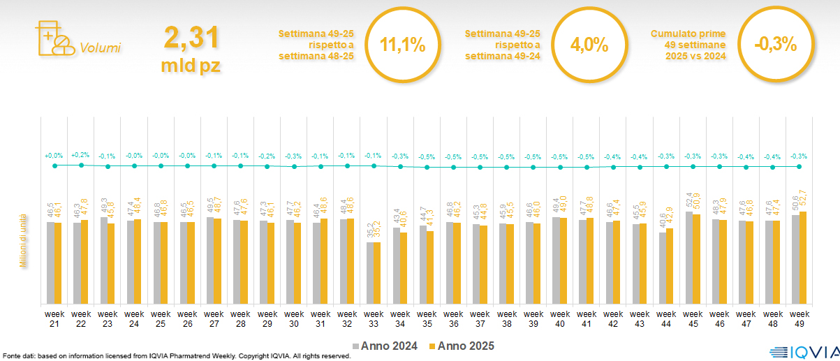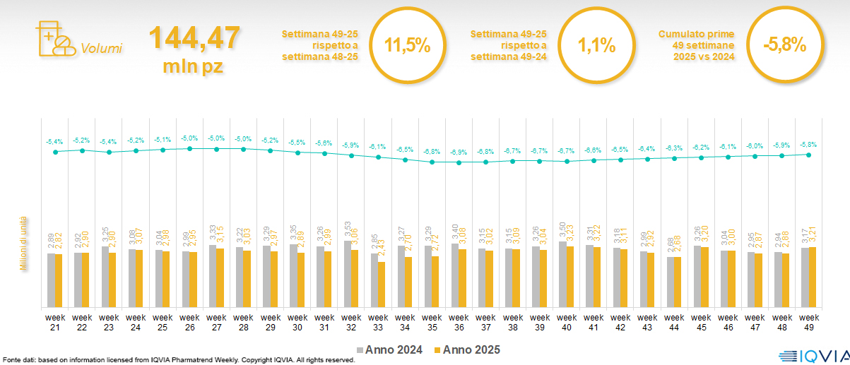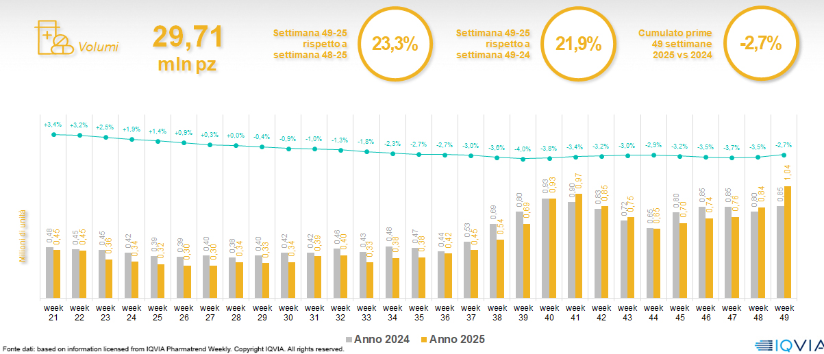 Con l’ingresso nel mese di dicembre e l’avvicinarsi del picco influenzale previsto per le ultime settimane dell’anno, il mercato farmaceutico italiano mostra i primi segnali di una graduale ripresa dei consumi. I dati aggiornati IQVIA relativi ai primi undici mesi del 2025 delineano un quadro ancora prudente sul fronte dei volumi, ma con indicazioni incoraggianti rispetto alle settimane precedenti.