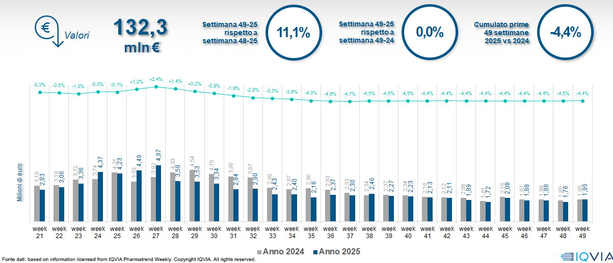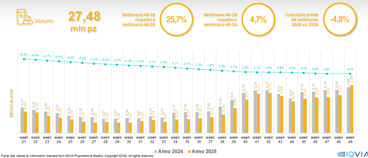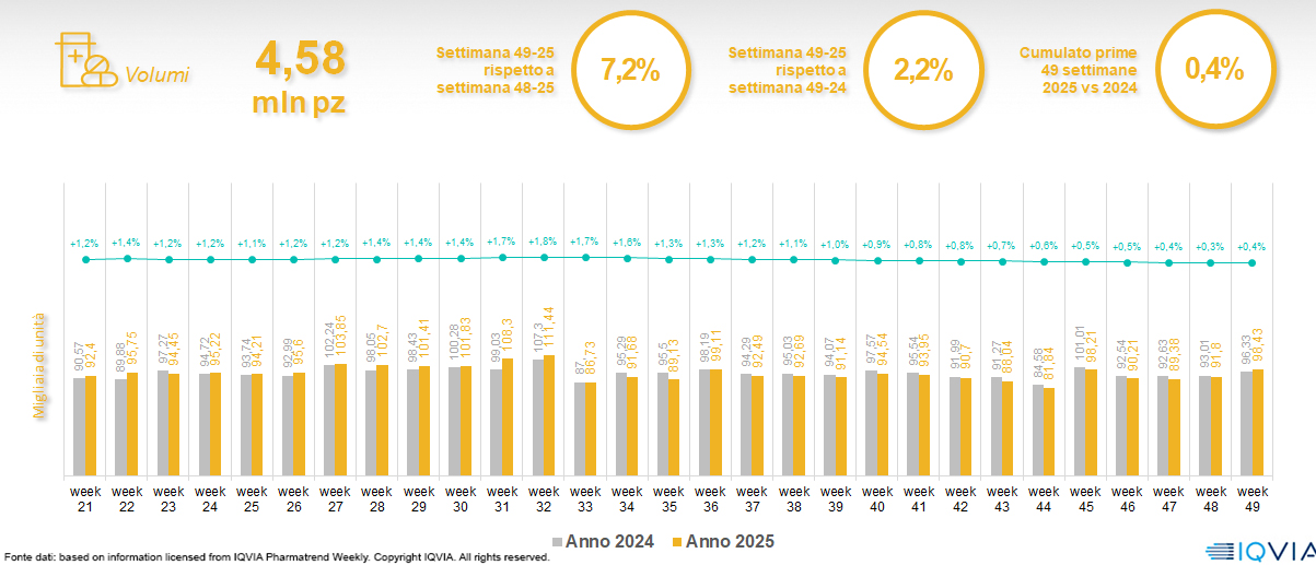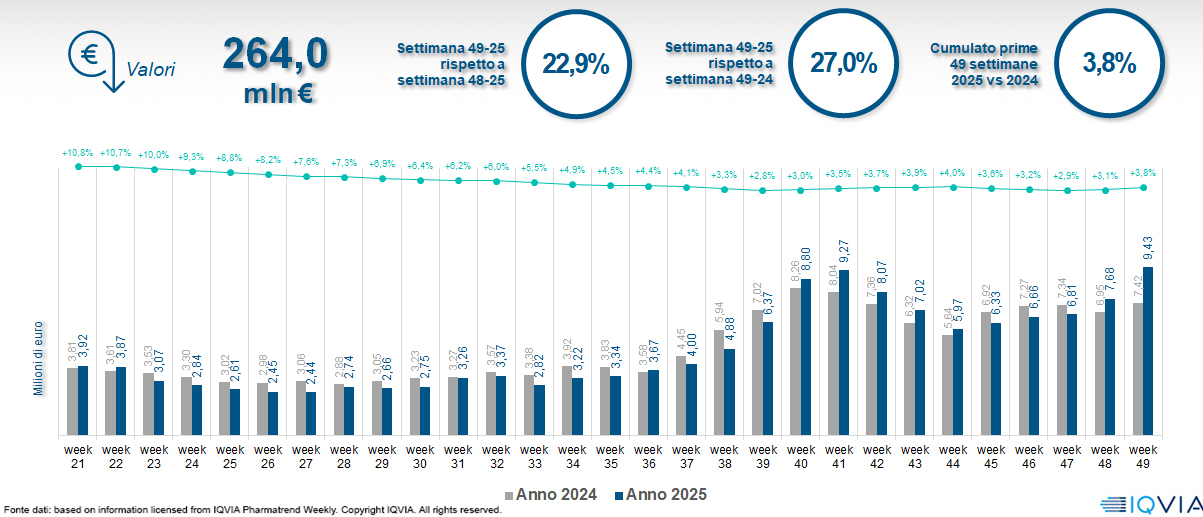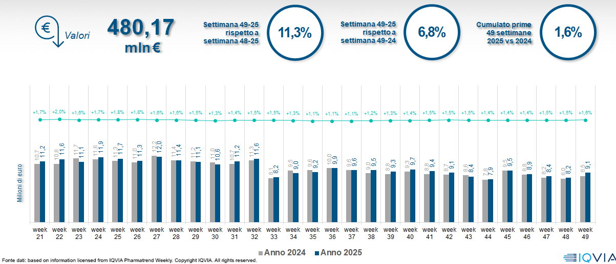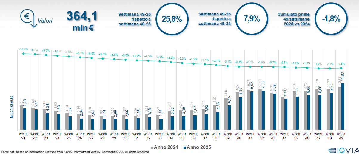 Fonte: dicembre 2025, “Iqvia, prosegue la “ripresina” dei consumi in attesa del picco stagionale di fine dicembre“, PharmacyScanner
