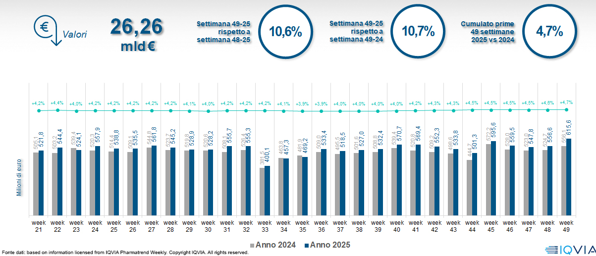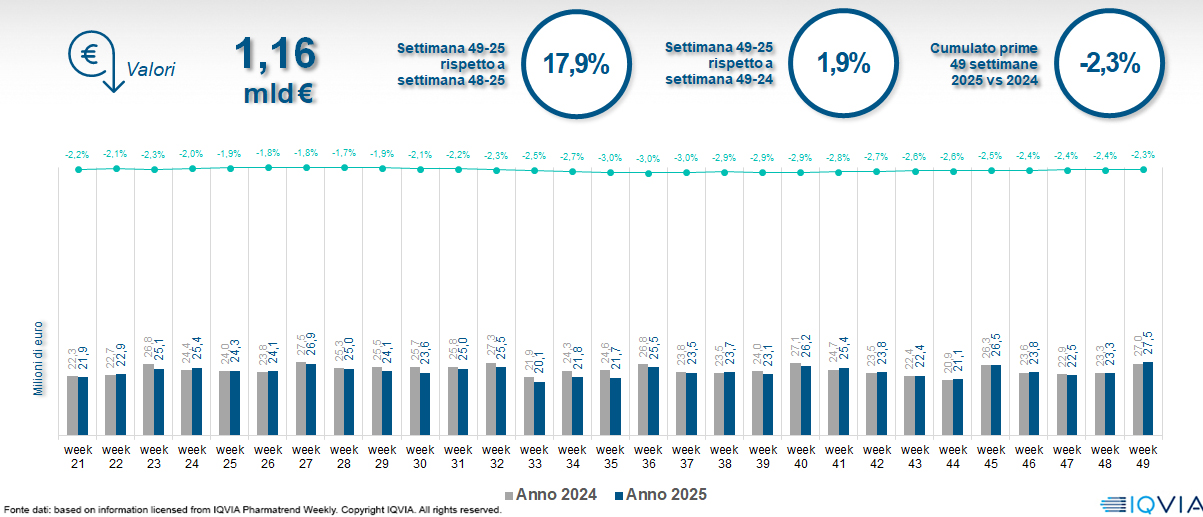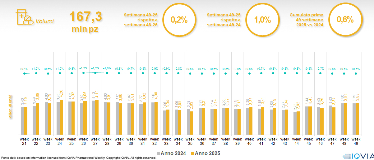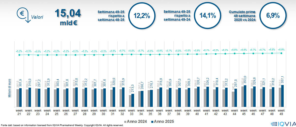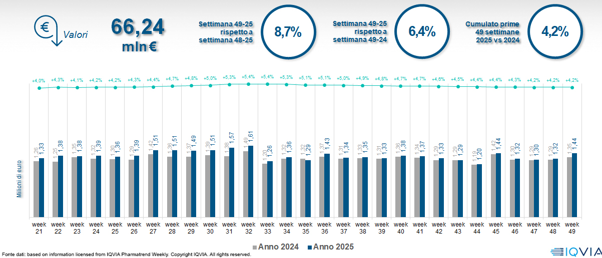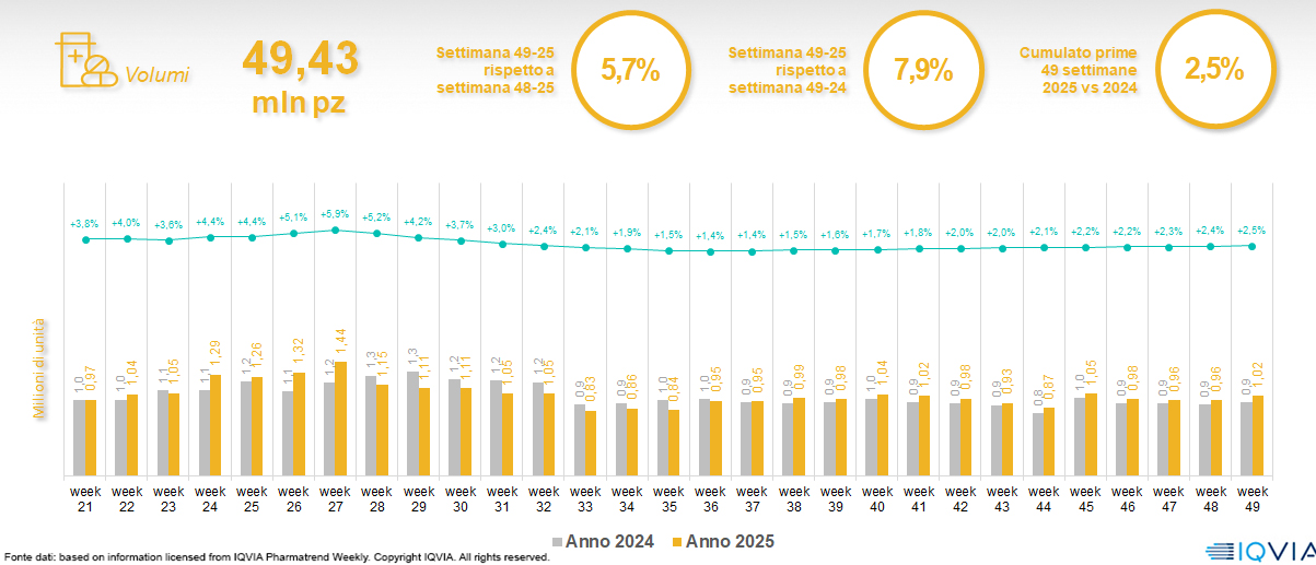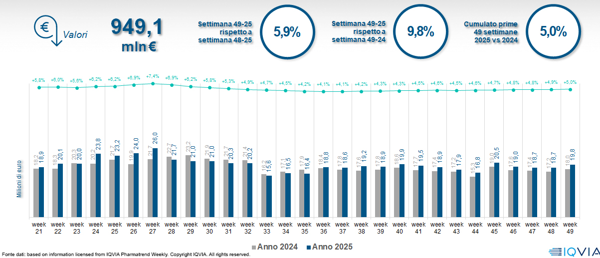 Fonte: dicembre 2025, “Iqvia, prosegue la “ripresina” dei consumi in attesa del picco stagionale di fine dicembre“, PharmacyScanner