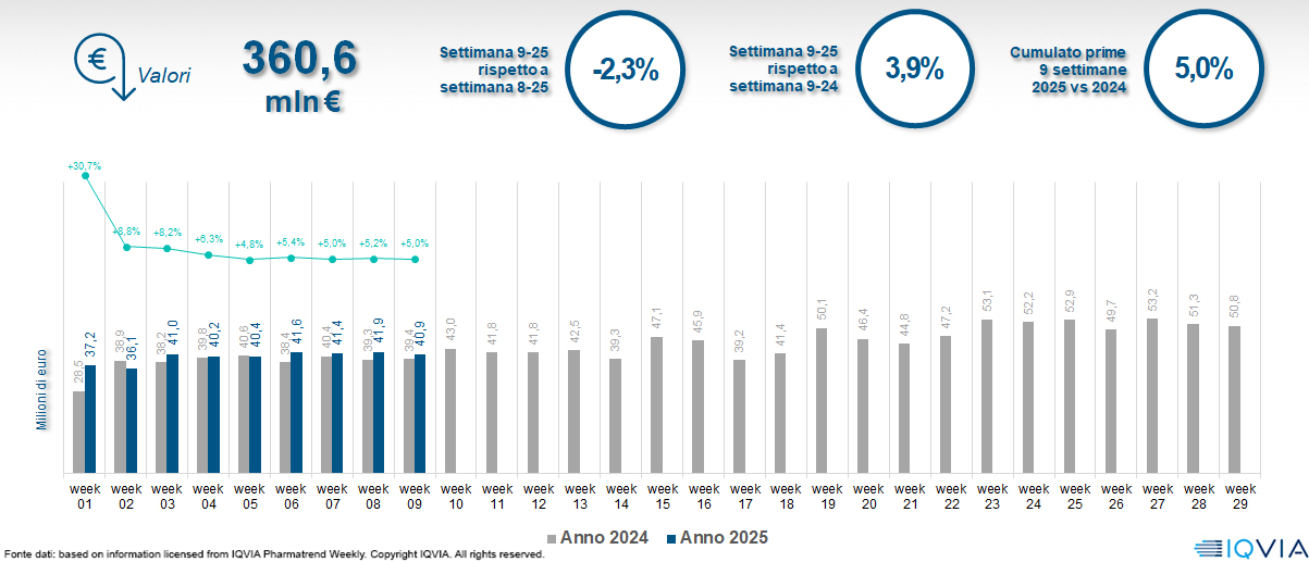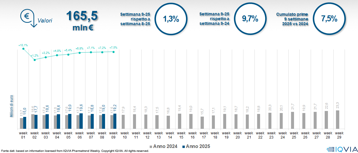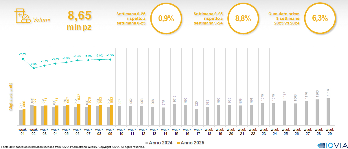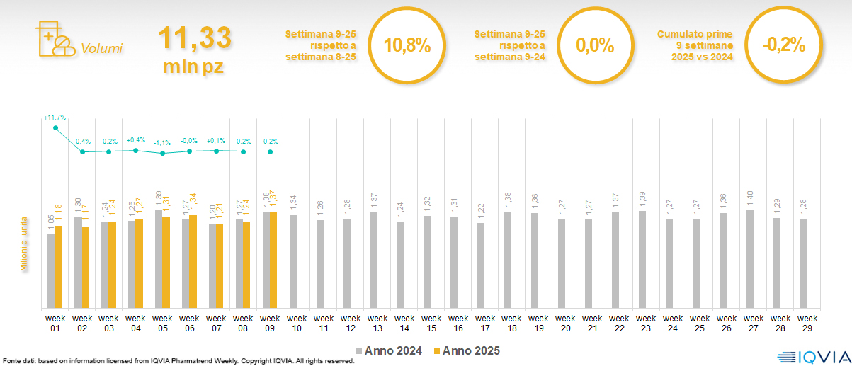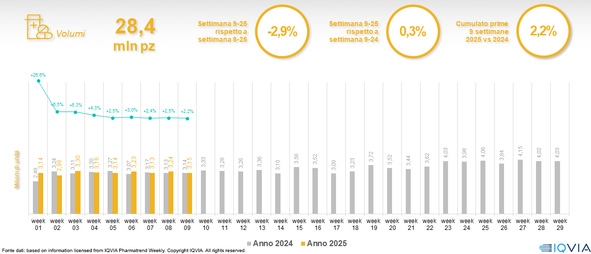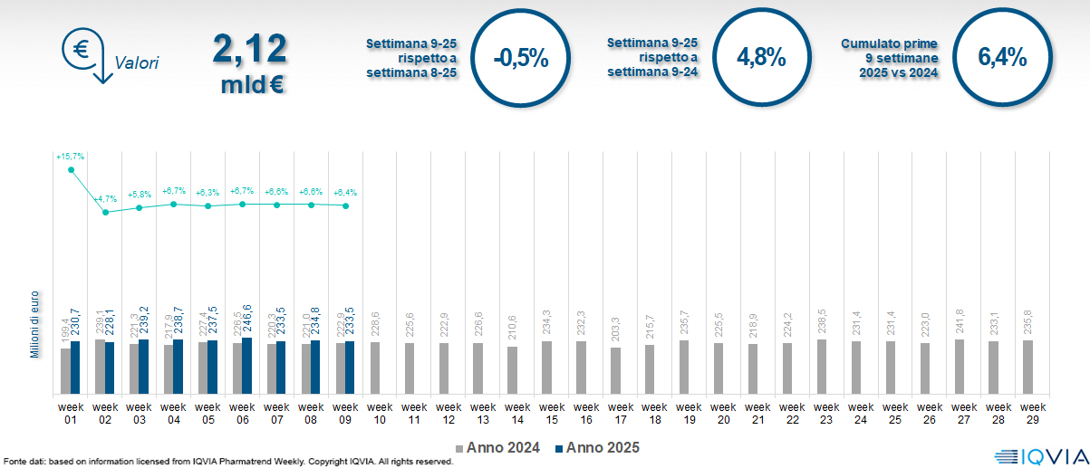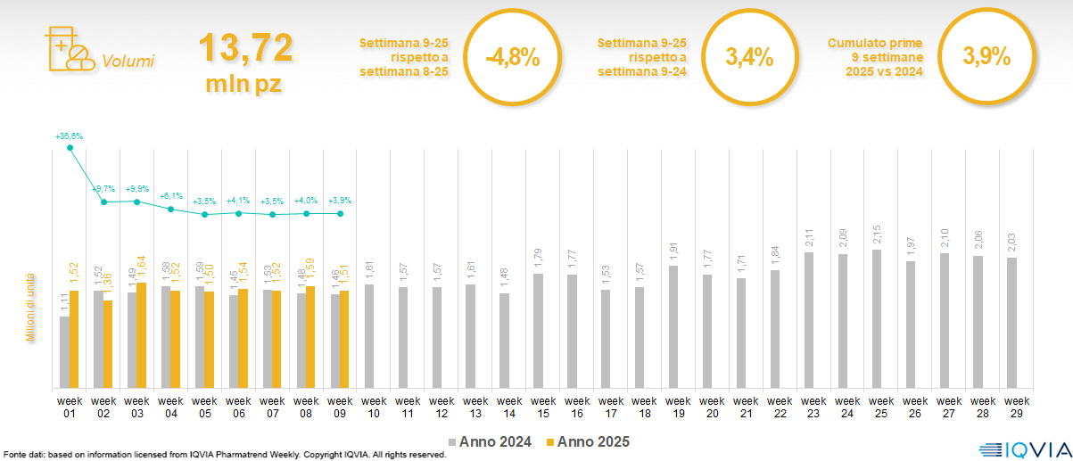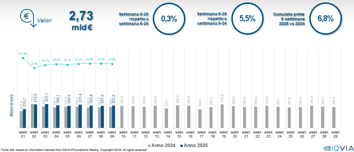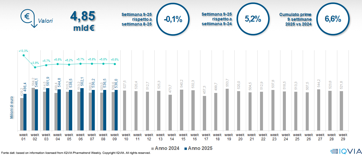 Il mercato farmaceutico conferma un andamento positivo e una crescita stabile nella nona settimana del 2025. Il fatturato del settore si avvicina ai cinque miliardi di euro, segnando un incremento del 6,6% rispetto allo stesso periodo dell’anno precedente.