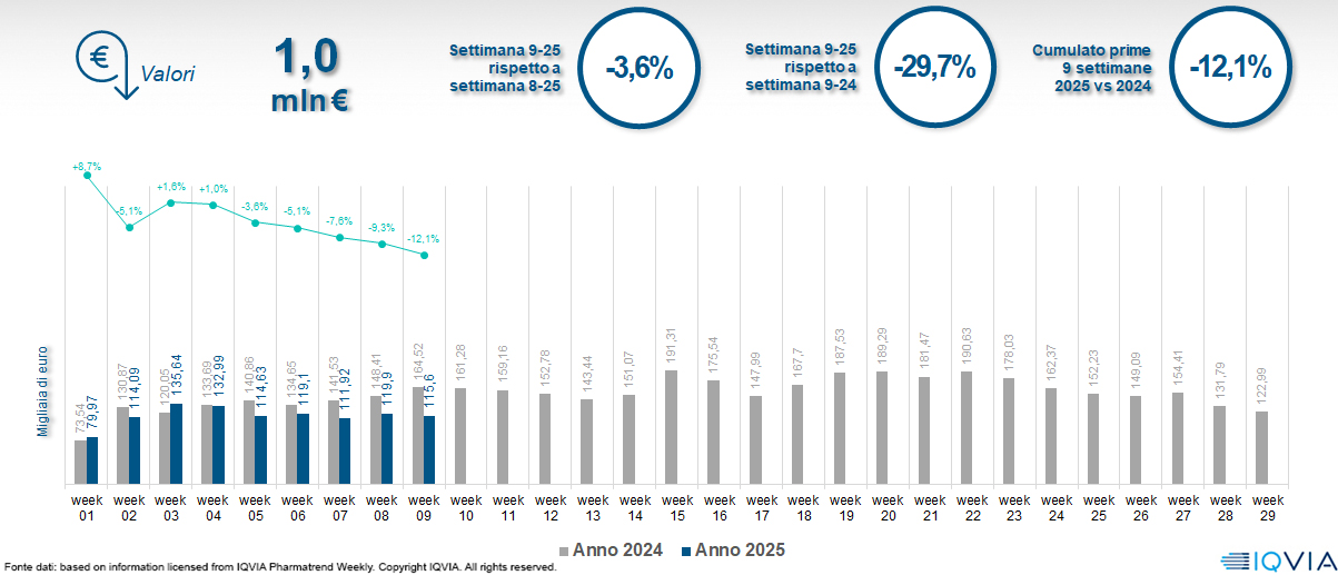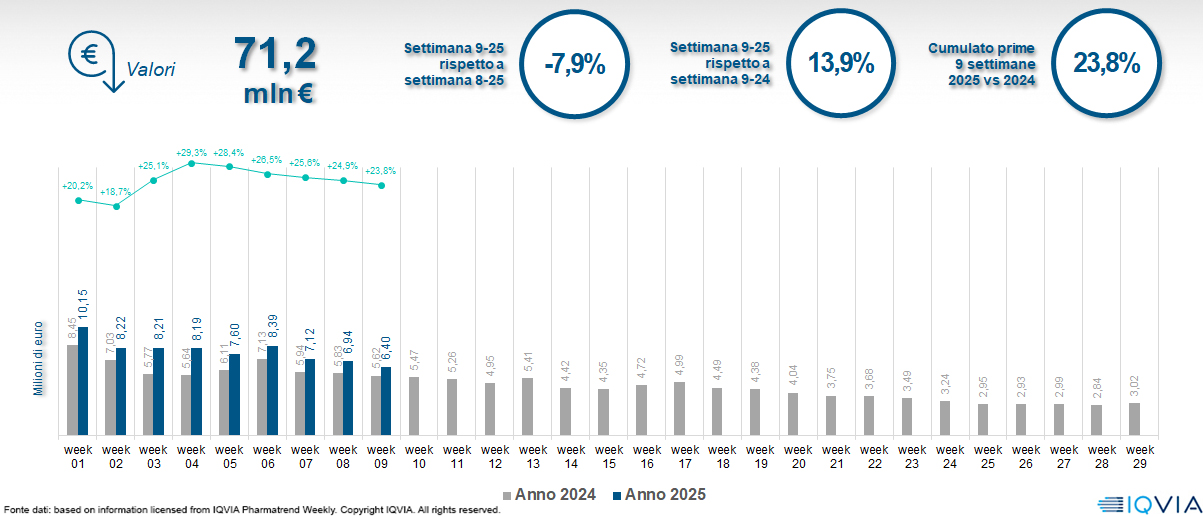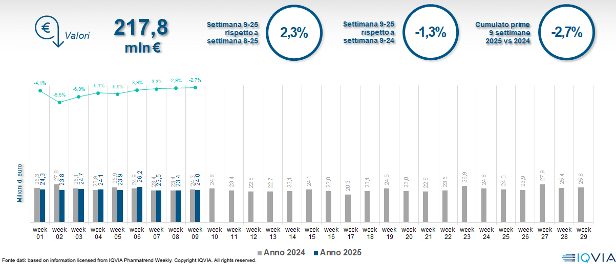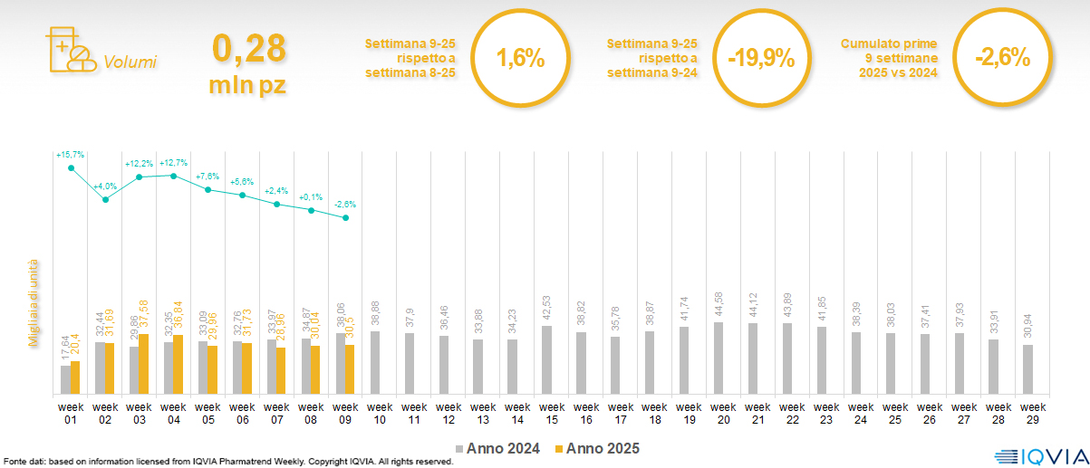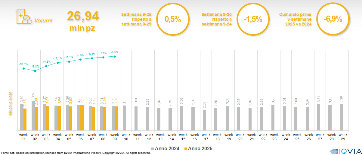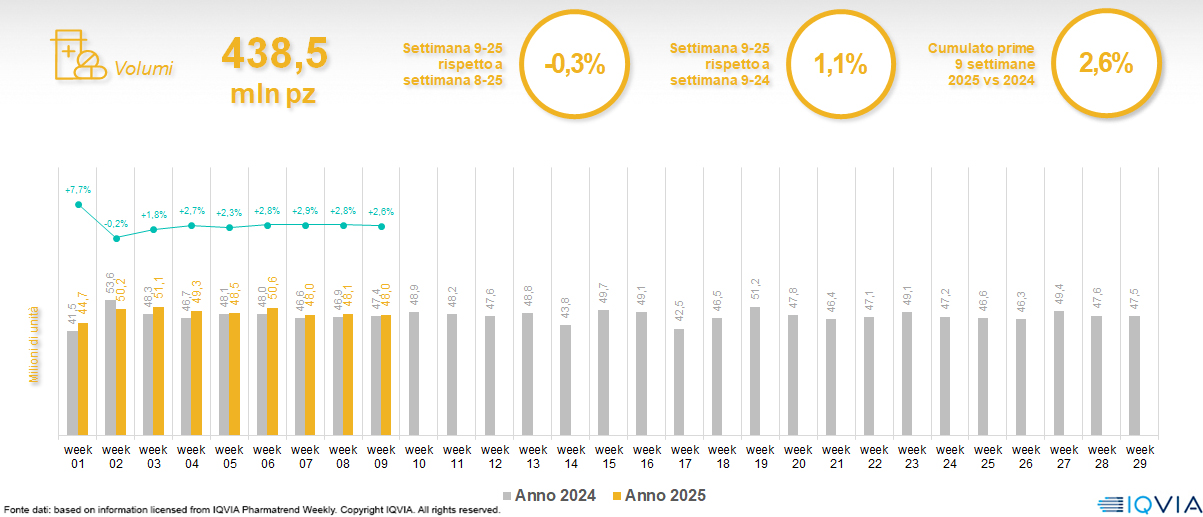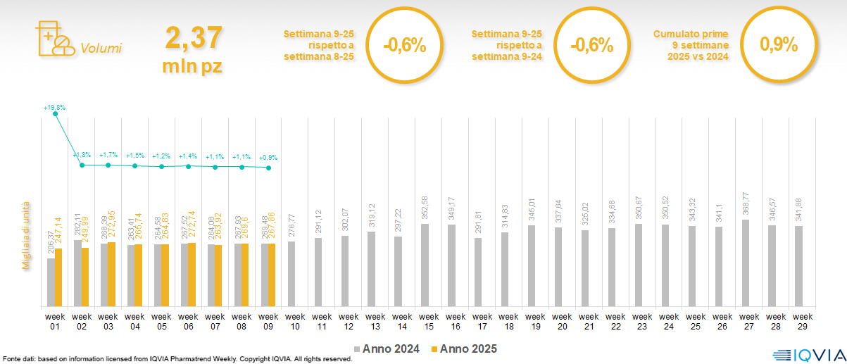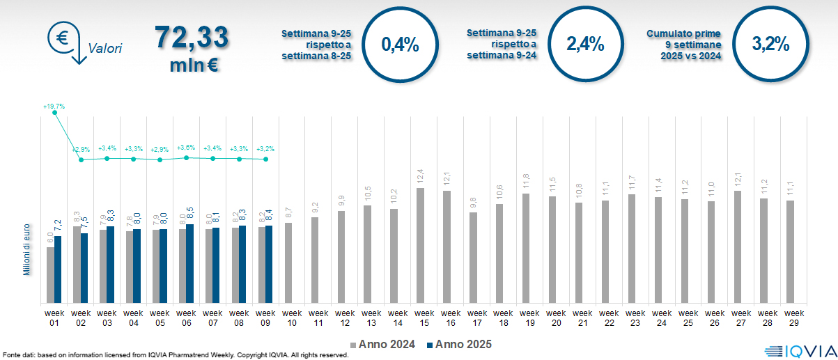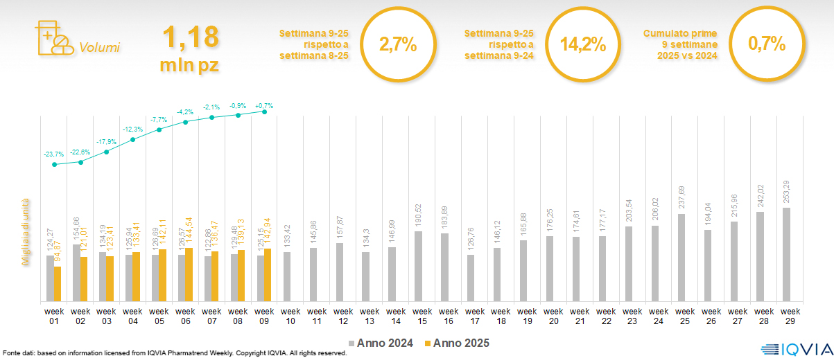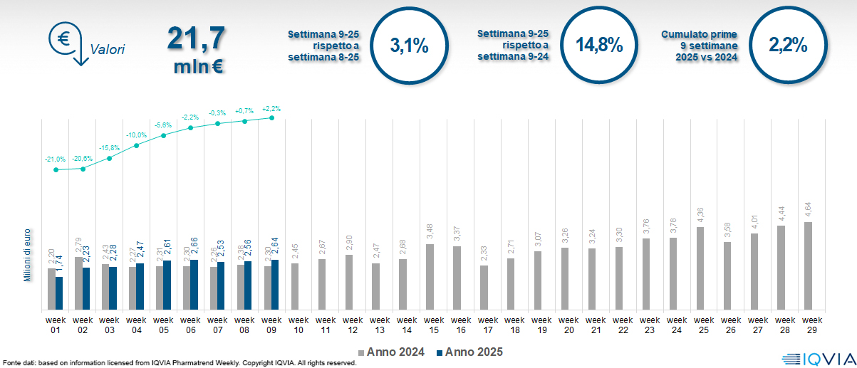 Il mercato farmaceutico conferma un andamento positivo e una crescita stabile nella nona settimana del 2025. Il fatturato del settore si avvicina ai cinque miliardi di euro, segnando un incremento del 6,6% rispetto allo stesso periodo dell’anno precedente.