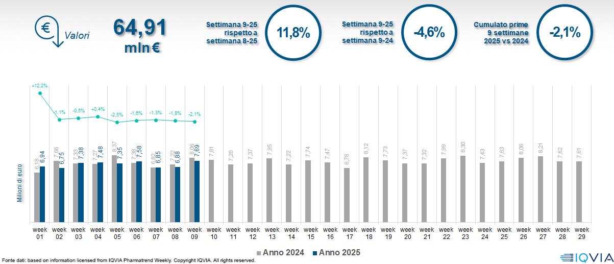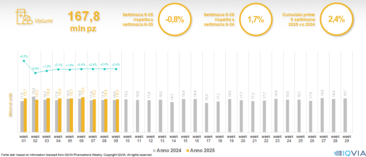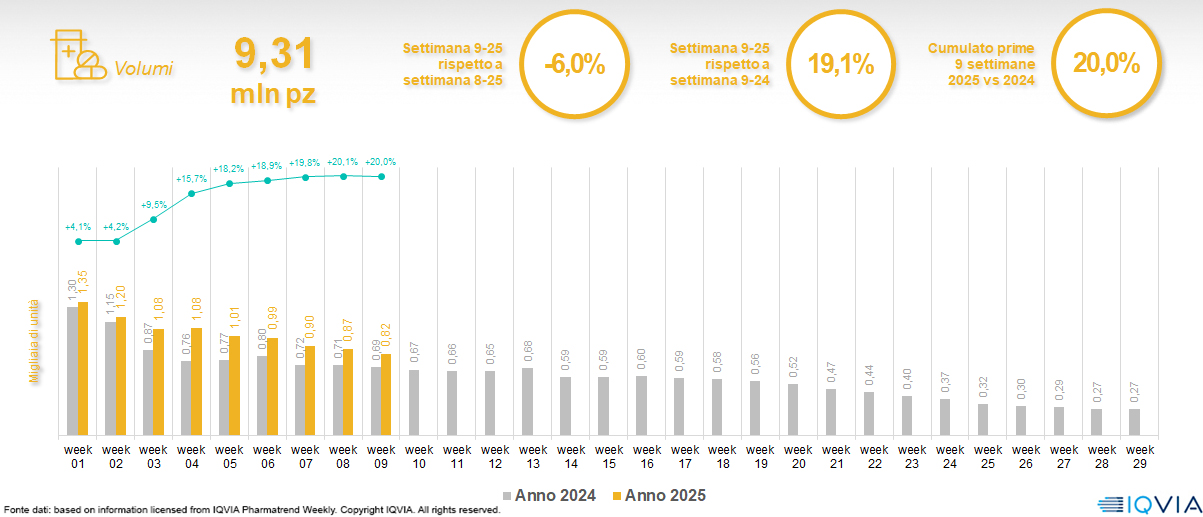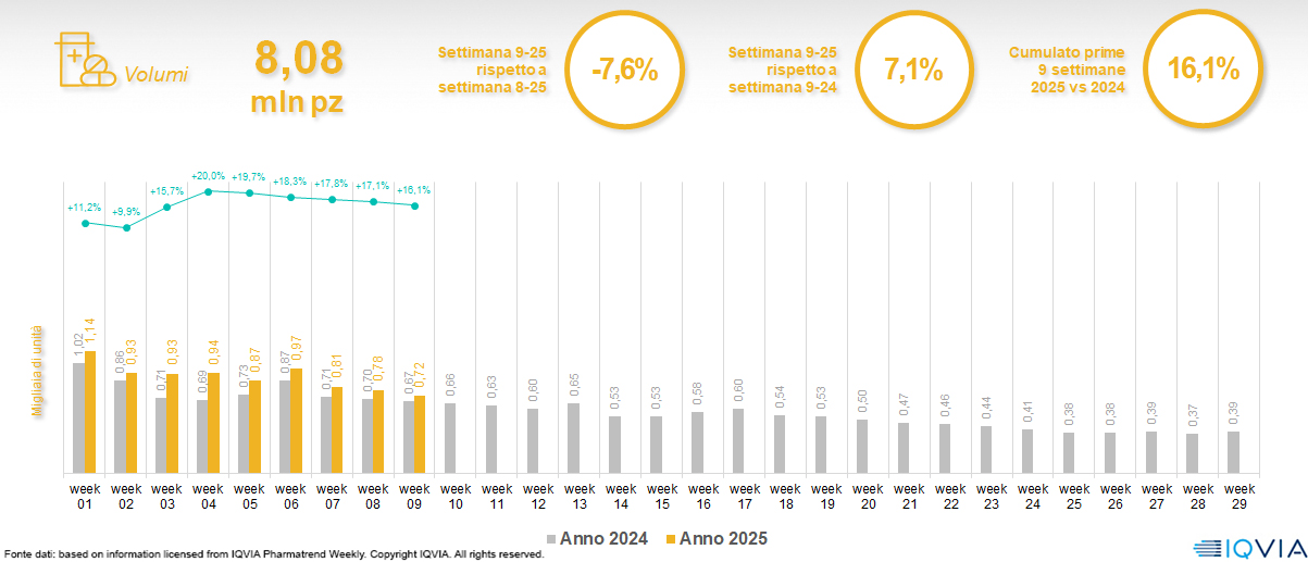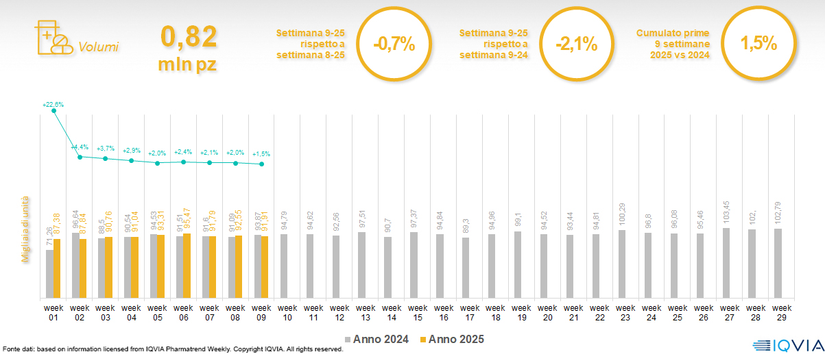 Fonte: IQVIA, “Iqvia, giro d’affari e consumi in farmacia restano in crescita stabile anche alla nona settimana“, PharmacyScanner