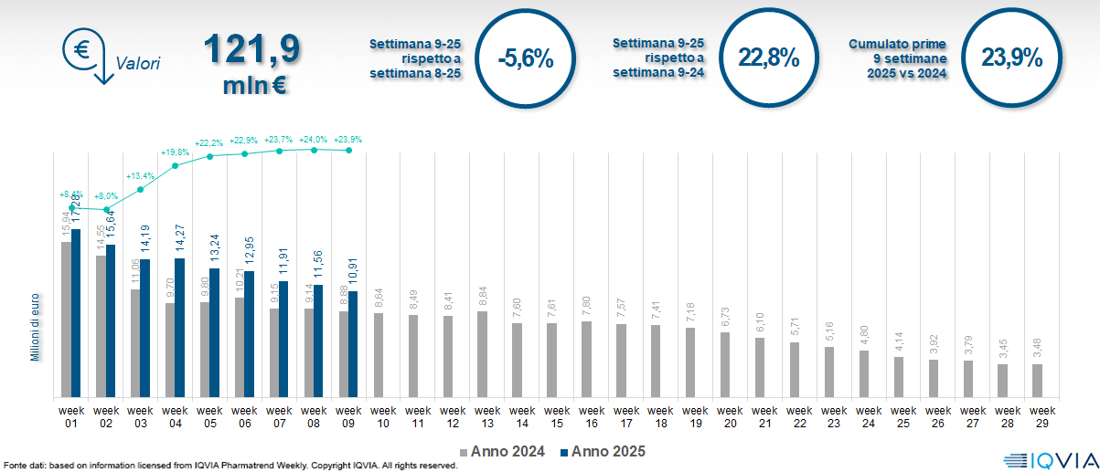 Infine, i prodotti stagionali, mostrano una crescita più contenuta rispetto alle settimane precedenti, pur mantenendo aumenti a doppia cifra. Questo suggerisce che la stagione influenzale sta lentamente perdendo intensità, ma i disturbi legati alle basse temperature continuano a influenzare la domanda di questi prodotti.