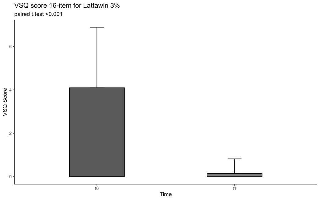 Il grafico mostra la drastica riduzione del punteggio VSQ 16-item tra il tempo T0 (inizio trattamento) e T1 (dopo 4 settimane).